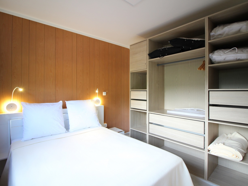 Une chambre lit 140 bénéficiant d'un bel espace rangements et équipée de rideaux occultants,