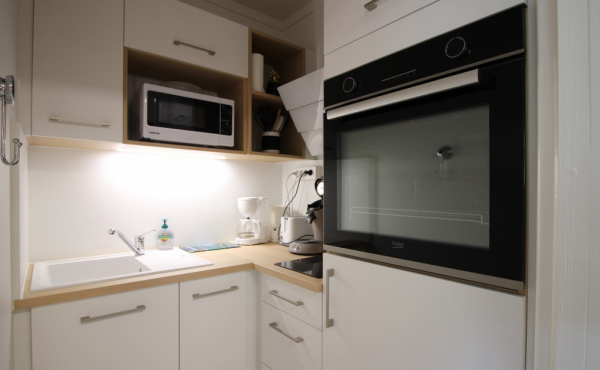 Une cuisine équipée avec plaque 2 zones induction, hotte, réfrigérateur Top avec espace congélateur, four, micro-ondes ...