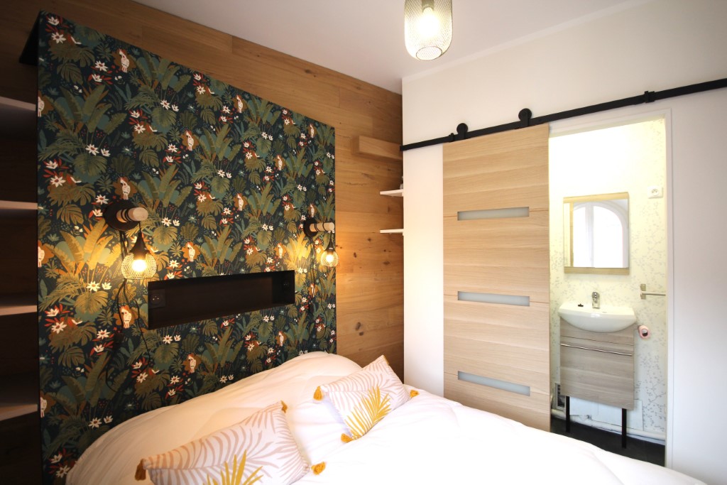 Mais encore, l'appartement dispose d'une chambre avec lit double (en 140) et salle d'eau avec douche et WC.