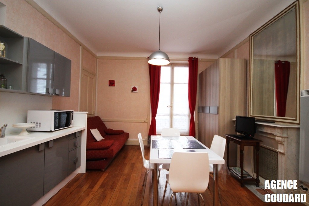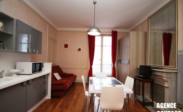 Belle pièce de vie parquet avec 1 banquette clic clac 2 personnes, télévision. Une cuisine US équipée, un espace nuit avec 1 lit 2 personnes.