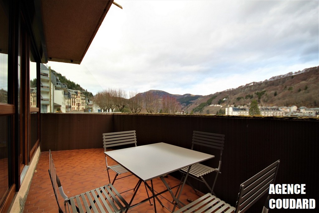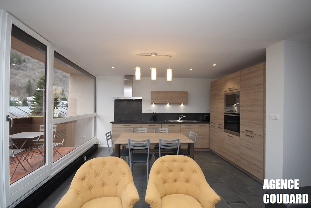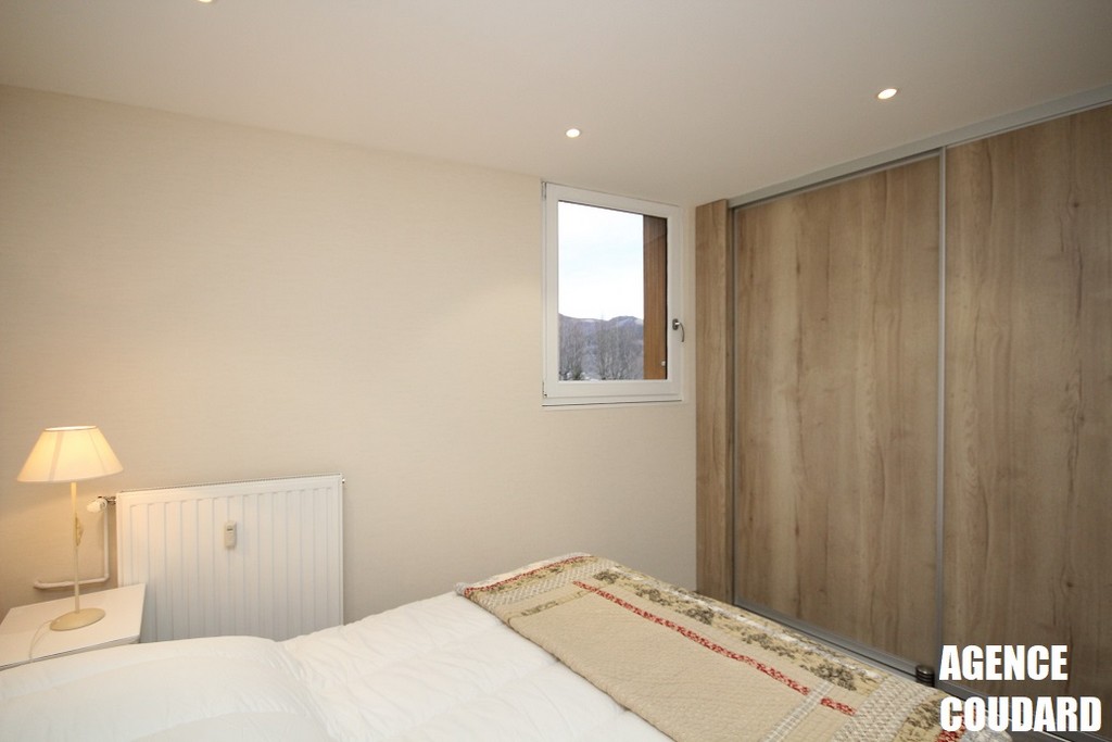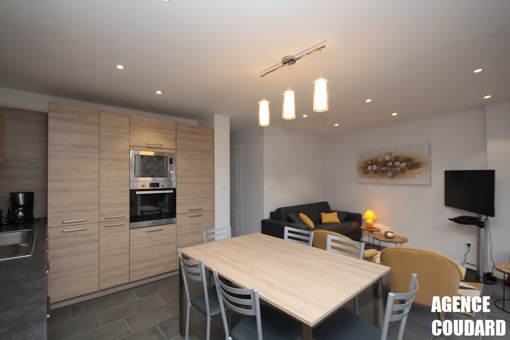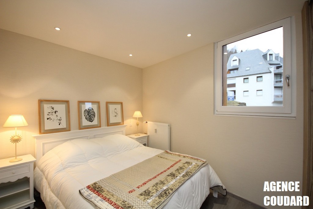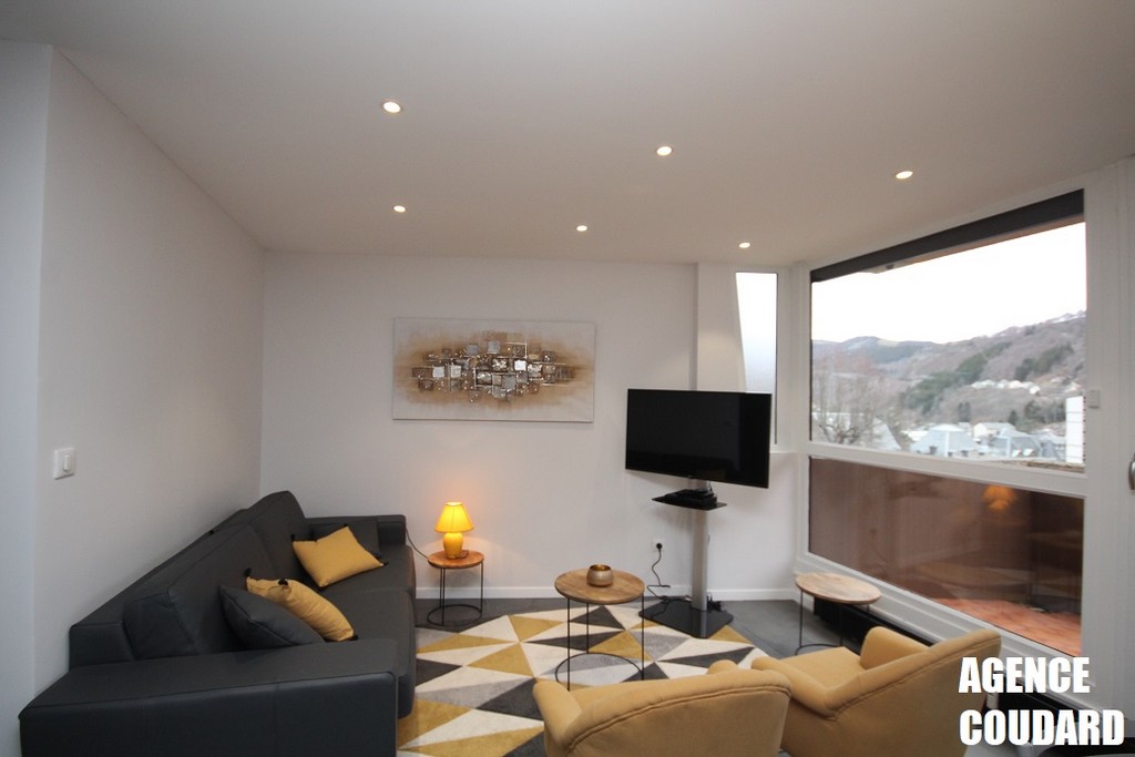 Il se compose d'une belle pièce à vivre combinant séjour, et cuisine US / salle à manger, le tout exposé EST, et ouvrant sur une grande terrasse bénéficiant d'une agréable vue sur le Puy Gros. Cette pièce à vivre dispose d'un canapé convertible en lit deux personnes.