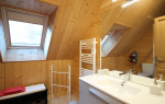 Salle d'eau (douche) avec séche-serviettes, lave-linge, séche-linge et espace bébé.