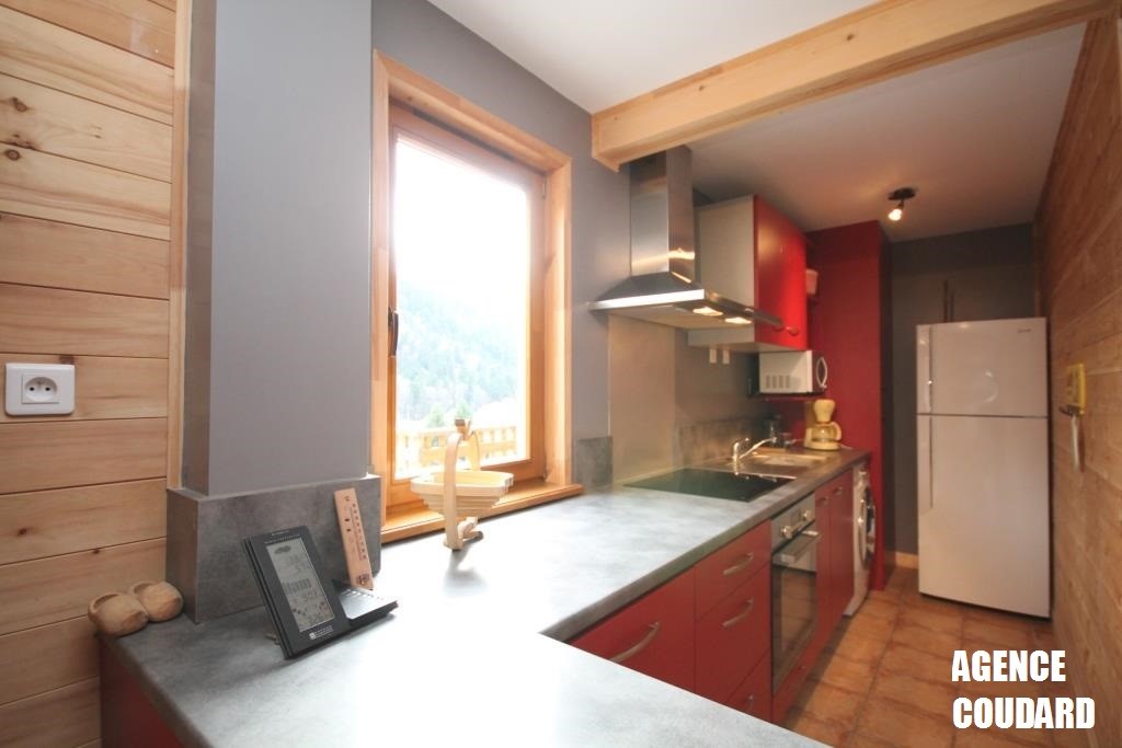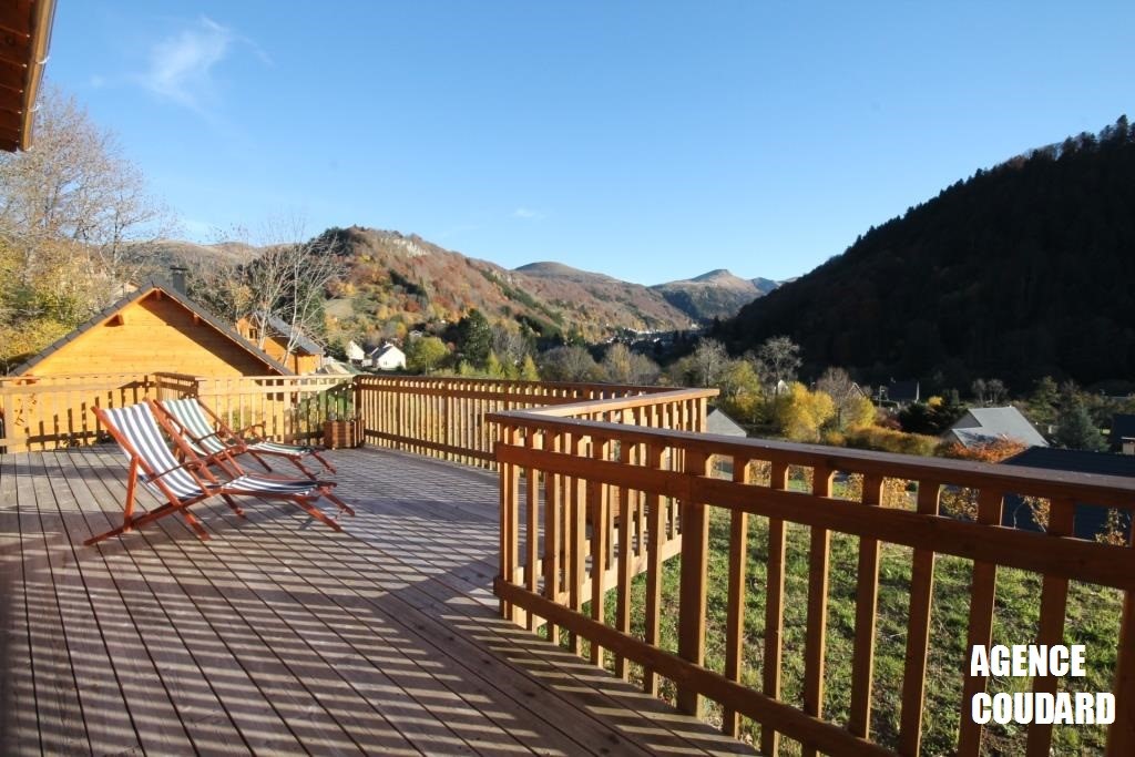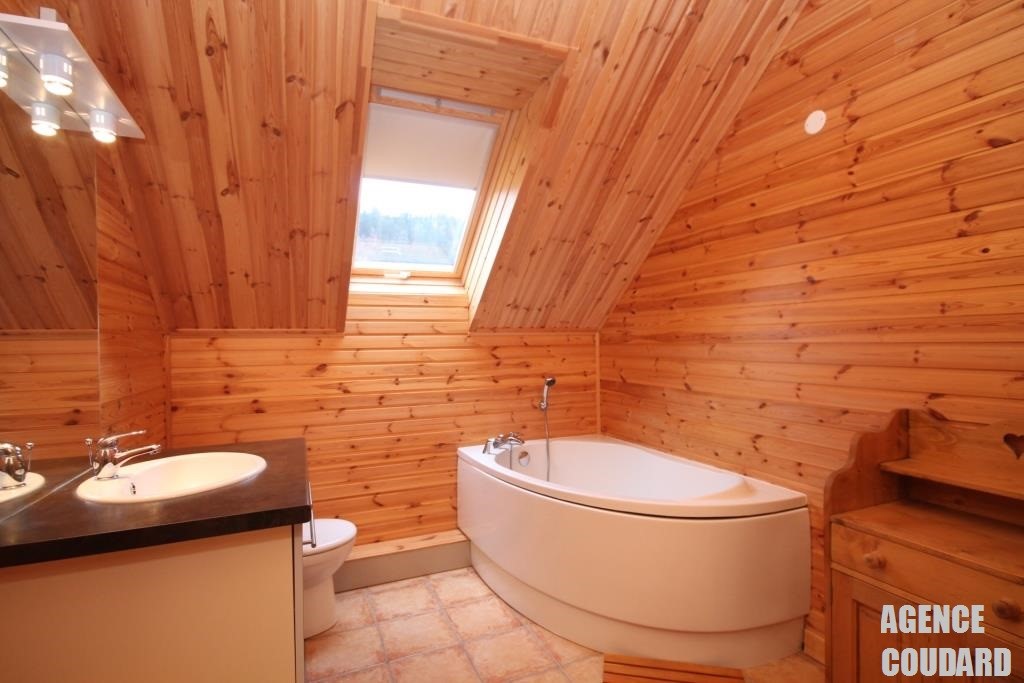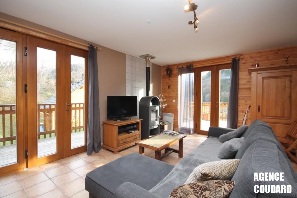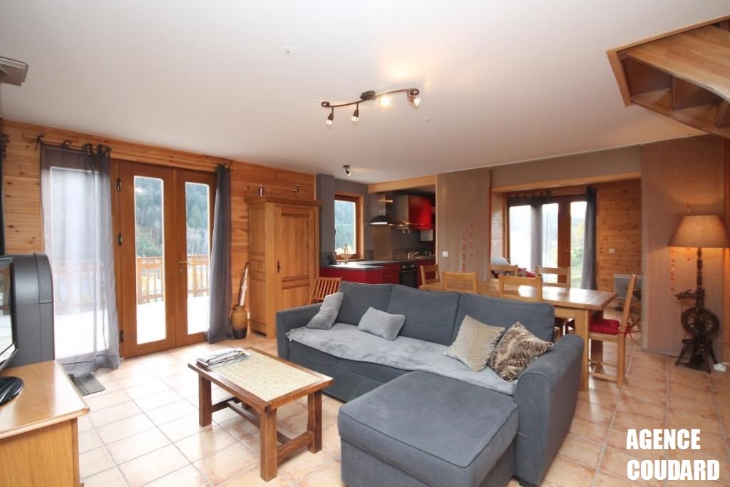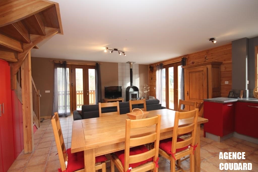 Pièce à vivre ouvrant sur terrasse, poêle à bois, cuisine US équipée avec lave-vaisselle, lave-linge, réfrigérateur G.M. et congélateur, salle d'eau, wc indépendant.