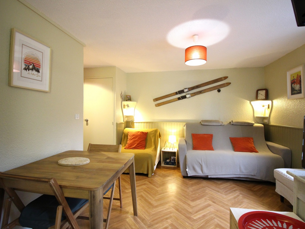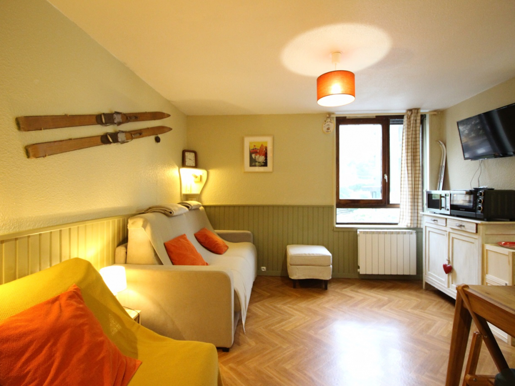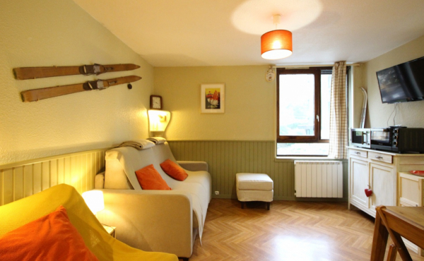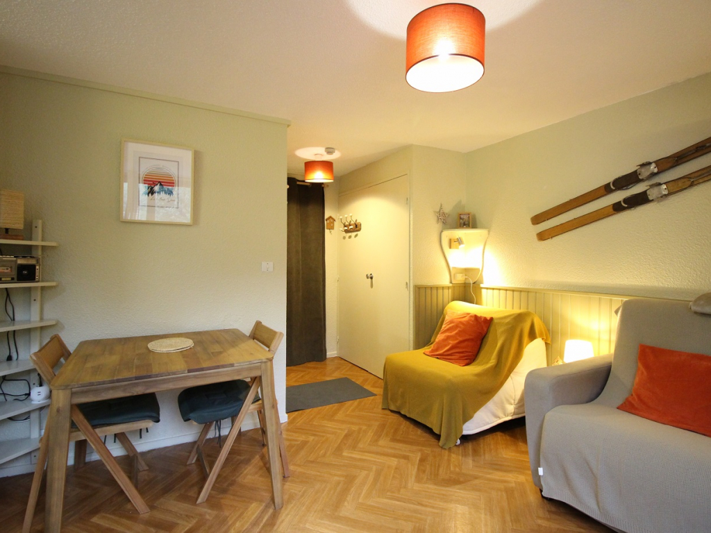 Ce studio est composé d'une entrée avec rangements, une piéce à vivre exposé Sud équipée d'un convertible en couchage double de type rapido et une chauffeuse convertible en couchage simple.