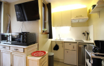 Cuisine US équipée comprenant plaque de cuisson vitrocéramique 2 zones, hotte, réfrigérateur avec congléateur, mini-four, micro-ondes...