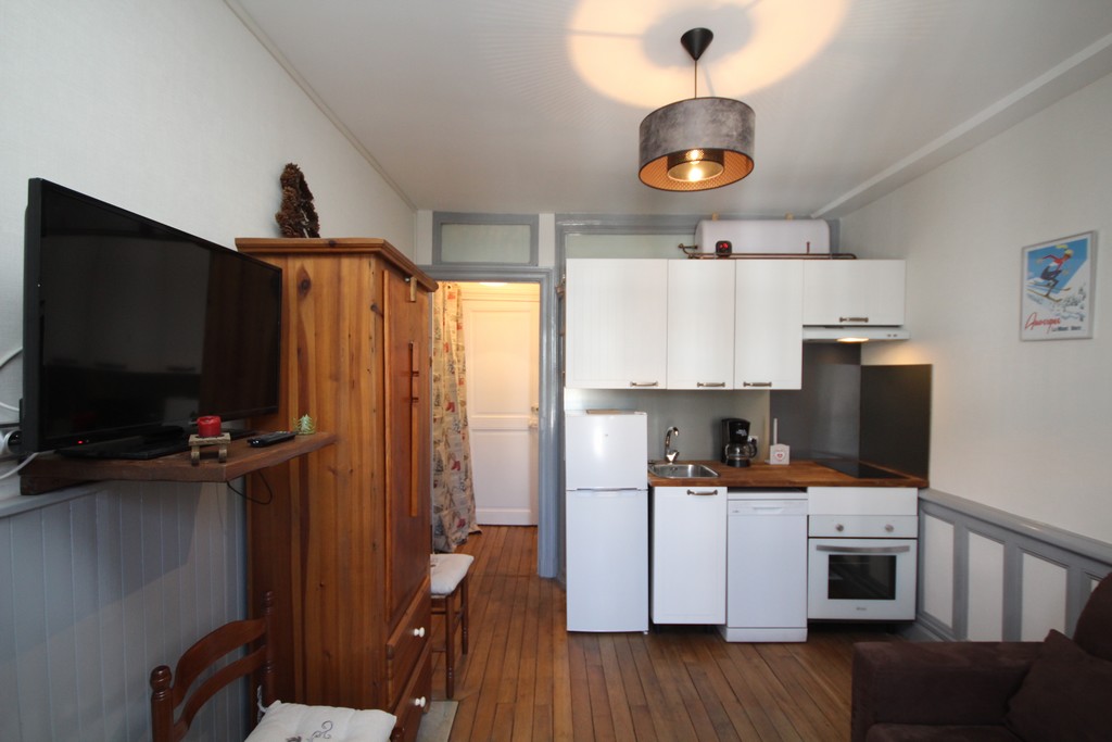 Il se compose d'une agréable pièce à vivre (avec canapé rapido deux personnes) et cuisine US équipée (notamment grand réfrigérateur, four, lave-vaisselle ...), le tout donnant au calme sur la cour intérieure de la Résidence.