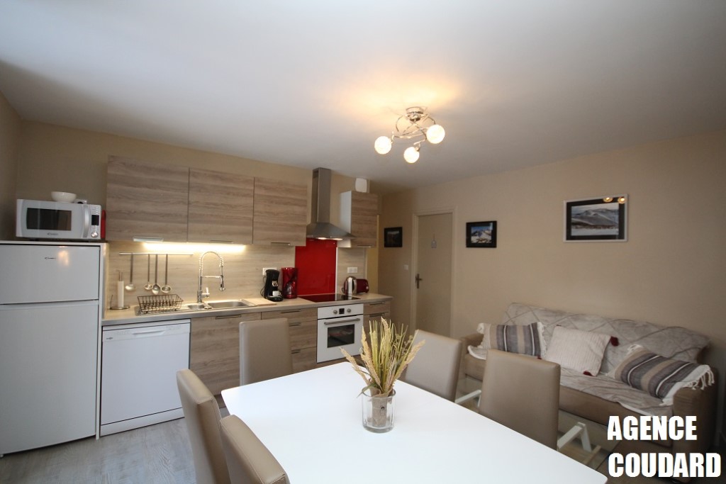 Il se compose d'une vaste entrée avec un local à skis, une agréable pièce à vivre combinant séjour, salle à manger et cuisine US équipée (grand réfrigérateur, four, lave vaisselle etc ...), cette pièce dispose d'un canapé convertible en lit deux personnes.