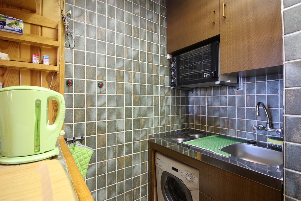 Kitchenette équipée avec plaque cuisson 2 zones, four, réfrigérateur top, micro-ondes, lave-linge ...