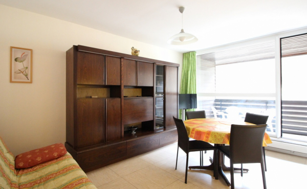 Hall d'entrée, séjour avec banquette clic clac 2 personnes ouvrant sur balcon, kitchenette équipée, une chambre avec 1 lit 2 personnes, salle de bains (baignoire) avec WC - lave linge.