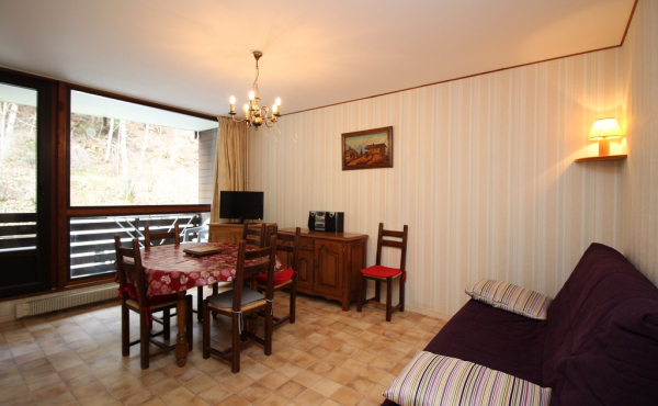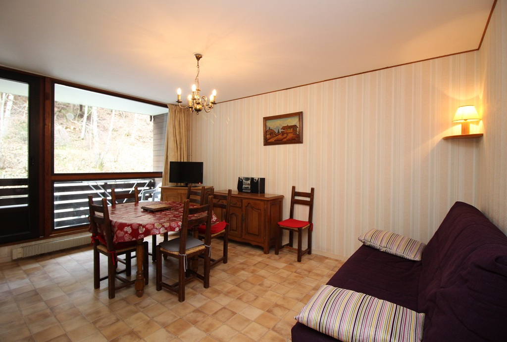 Hall d'entrée, séjour équipé d'un convertible clic-clac couchage 2 personnes et ouvrant sur balcon,
