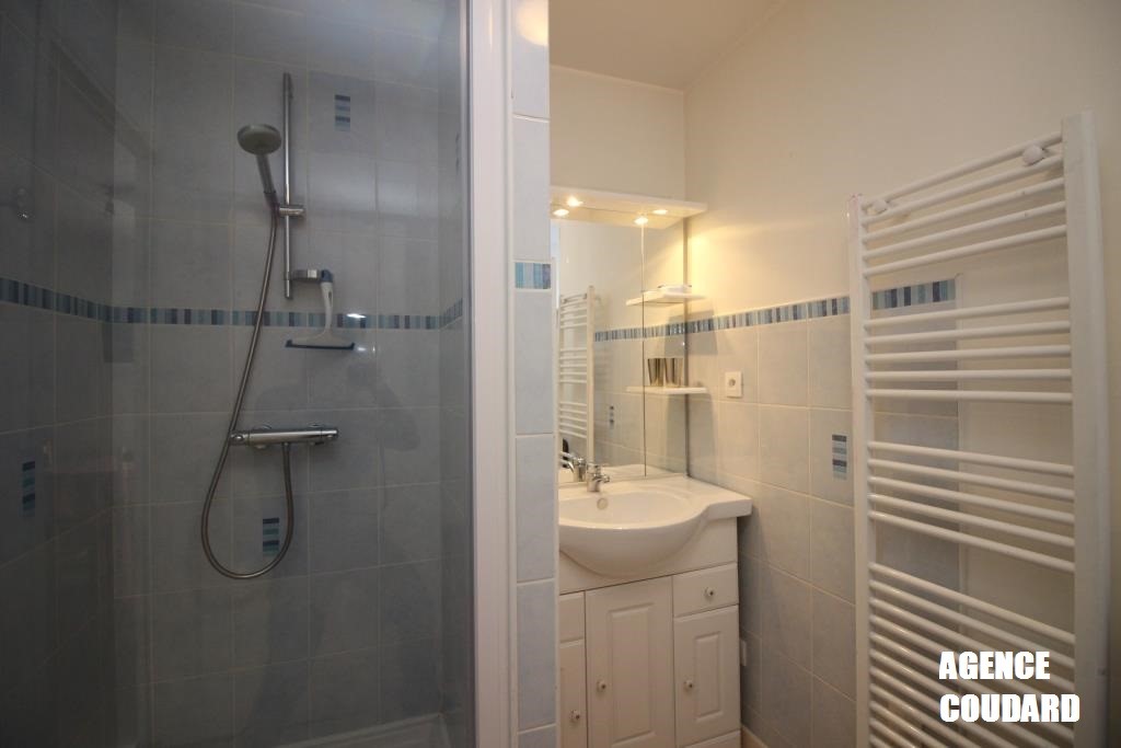 Salle d'eau (douche) avec sèche serviettes et lave linge.