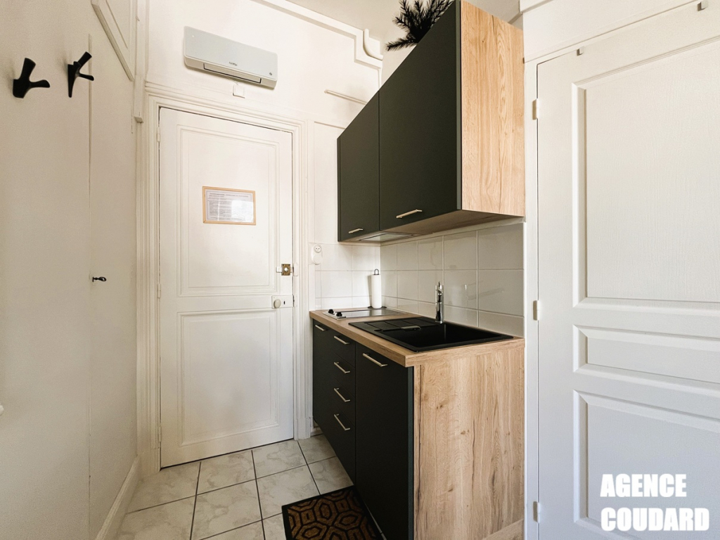 Il se compose d'une entrée avec rangements, une pièce à vivre combinant séjour et coin cuisine US (entièrement équipée), le tout donnant au calme sur la cour intérieure de l'immeuble.