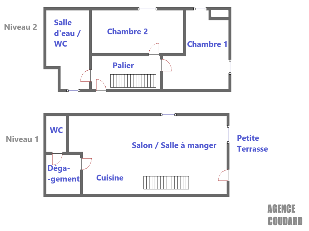 Le second niveau du duplex accueille quant à lui les deux chambres et une salle d'eau avec douche et WC.