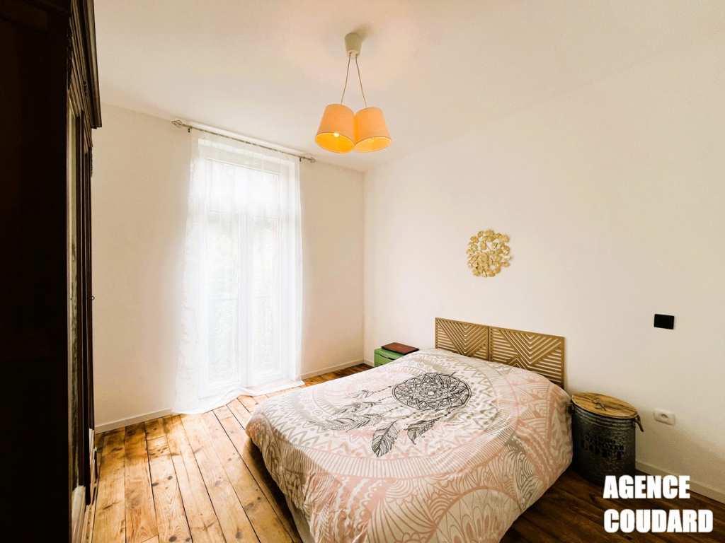 Le second niveau de la maison offre deux premières chambres, une salle d'eau (avec douche), cette salle d'eau dispose d'un double accès : un commun par le couloir et un accès direct depuis la plus grande chambre. Mais encore, ce niveau dispose d'un débarras qui pourrait s'aménager en dressing et d'un second WC indépendant.